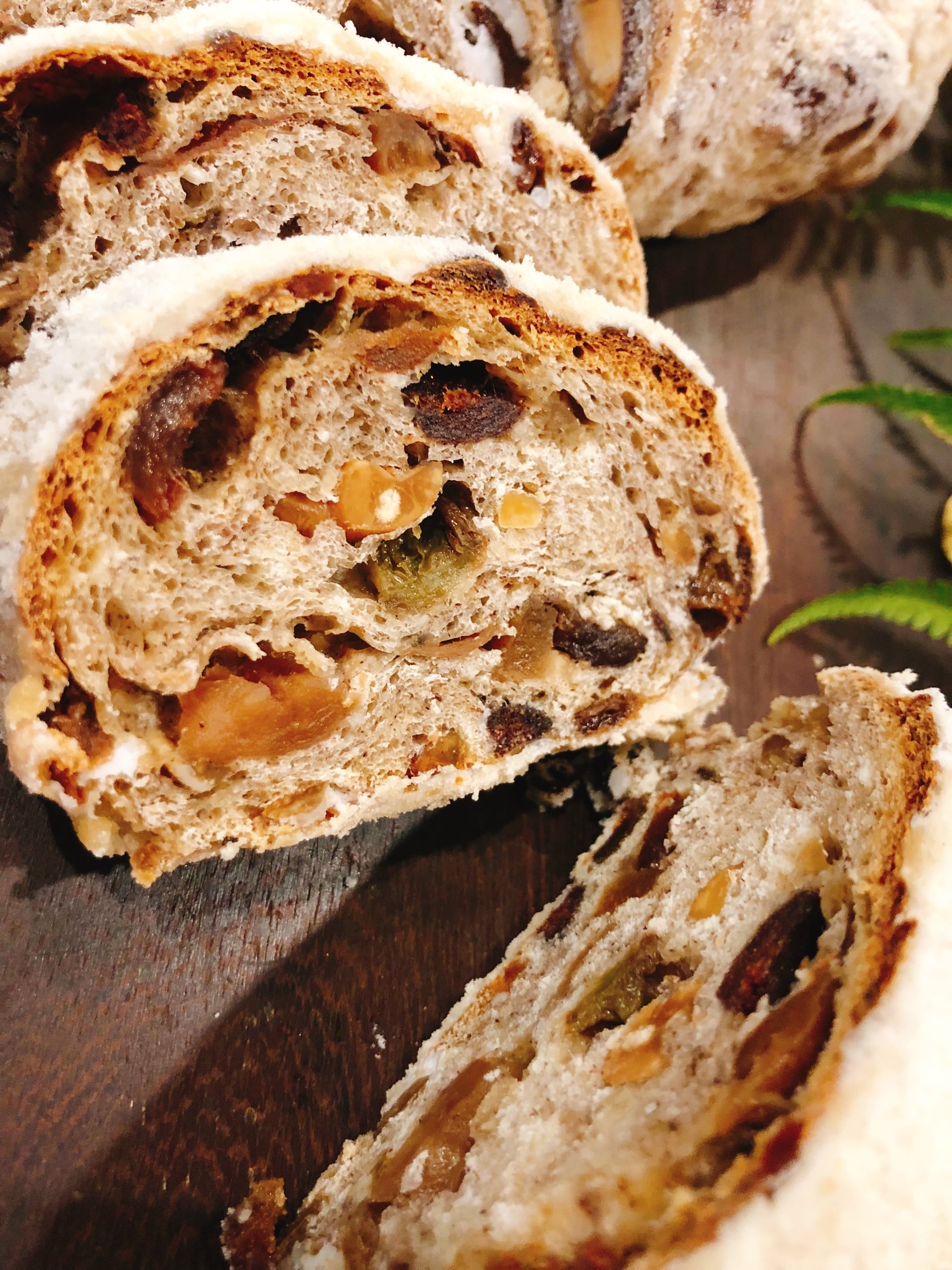 ⚪︎有機スペルト小麦&全粒粉 自家製酵 有機ドライフルーツ(自家製甘夏ピール 干し柿 アプリコット イチジク クランベリー ジャンボレーズン グリーンレーズン リンゴ(扇屋農園)
